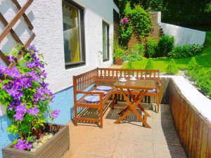 A private patio area can be found by the entrance area to this apartment and is furnished with garden table and benches, suitable for outdoor dining. A further bench can be found to the front of the apartment in a protected and sunny southerly position and a fenced garden area surrounds the accommodation. Sun loungers and suitable cushions, a parasol and also a BBQ are provided for your personal use. The peaceful position offers a wonderful panoramic view of the mountains.