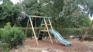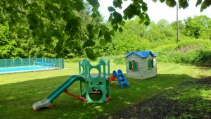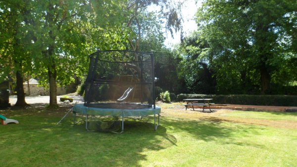 There is a trampoline, boules court, table tennis, slide and swings and some children's play toys